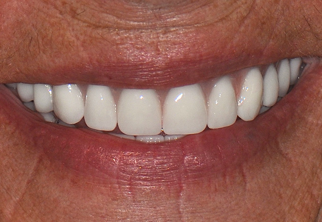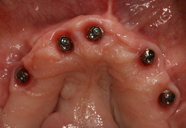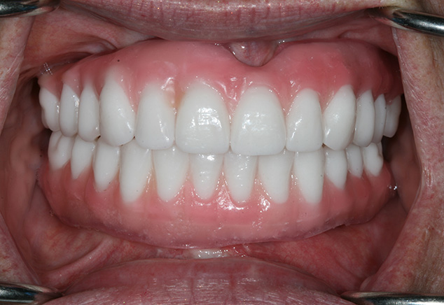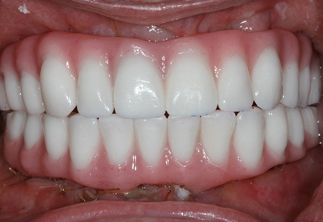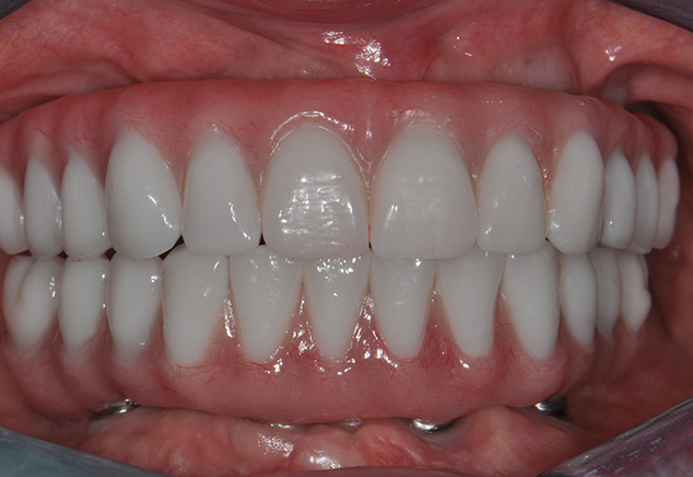 At the insertion appointment, the healing caps were removed and cleaned with Chlorhexidine. Figure 15 demonstrates the excellent healing of the soft tissue prior to insertion of the prosthesis. Once inserted, the esthetics, phonetics, and OVD of the prosthesis were confirmed. The occlusion was adjusted as needed. Screws were tightened to 15 Ncm, screw access openings were filled with Teflon tape to within 2mm of the surface, and a soft material such as Telio or Fermit was used to seal the access. A maxillary acrylic nightguard was fabricated to aid in protection of the occlusal surfaces from wear and to help reduce any parafunctional habits. The completed case is shown (Fig 15, Fig 16, Fig 17, Fig 18). At subsequent appointments, the prostheses were evaluated to determine if they needed to be removed to assess the soft tissue or if any contouring of the acrylic was necessary. Eventually the soft material used to close the access can be replaced with a hard composite material.