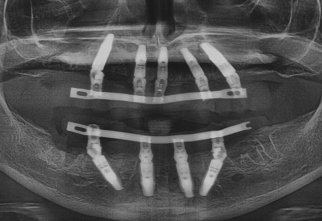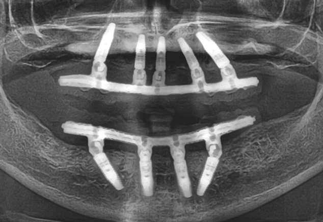 The next afternoon, the prostheses were inserted (Fig 10) and panoramic radiographic confirmation of proper seating was obtained (Fig 11). Any necessary occlusal adjustments were then completed. The patient was then seen every 2-3 weeks for deplaquing and plaque control review per our earlier discussed protocol. The occlusion was also refined as needed. A water irrigation device was given and reviewed at 6 weeks post-surgery.