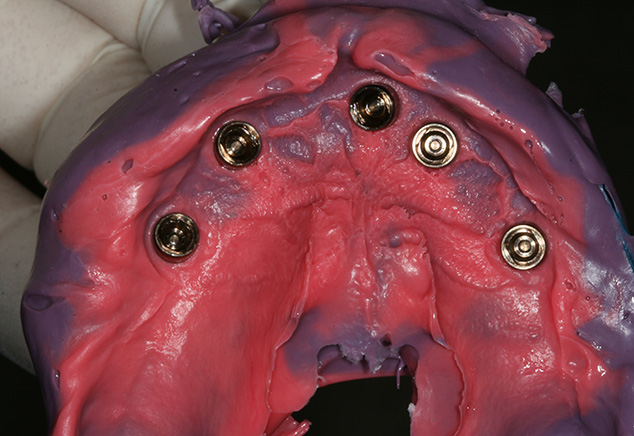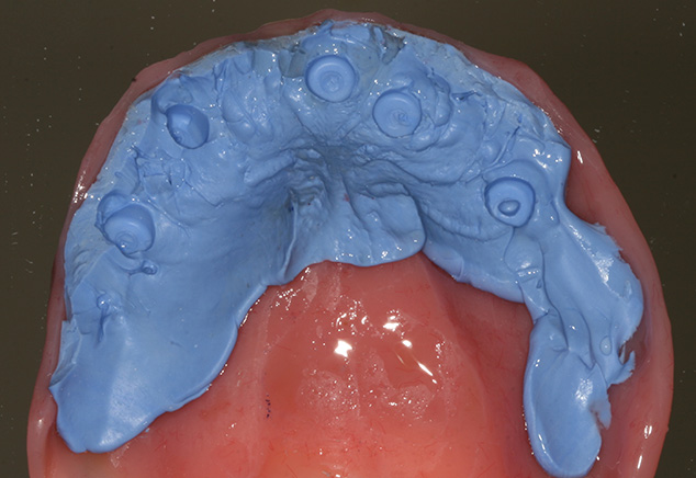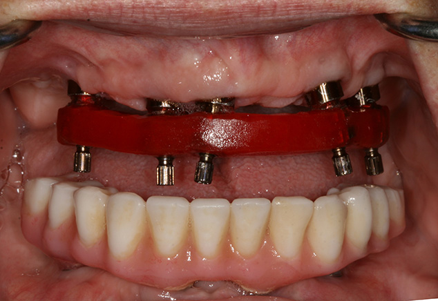 The patient was seen from Dr. Robert Levine's office for restorative records in preparation for immediate load protocol. The previously processed dentures were first checked with pressure paste to insure there was no contact of the intaglio surface with the tall healing caps. Bite registration material was then used to confirm there was no contact (Fig 9) and later will be used by the lab to articulate the models. Efforts were made to confirm the OVD (with the marked tongue depressor provided by Dr. Levine), incisal position, midline, plane of occlusion, and centric position with the prosthesis in place. Adjustments were made as needed. Photographs were acquired to document and relay information via e-mail to the lab technician. The lab will use the registration material left in the intaglio surface of the prostheses, as healing caps will be placed on the newly fabricated models. This allows the index to transfer the OVD and centric relationships with contact just on the healing caps. The soft tissue plays no role in this relationship. A bite registration was made to confirm centric relation. Healing caps were then removed and open tray impression copings were placed. If the connection between the implant abutments and the impression copings are not visualized, then x-ray confirmation of the connection is needed. Transfer Impressions were made using a custom tray and rigid impression material of choice, in this case polyether was used. Our lab courier delivered the dentures and impressions to the lab for the conversion to metal-reinforced, screw retained provisionals, which were delivered back to the restorative office within 24 hours.