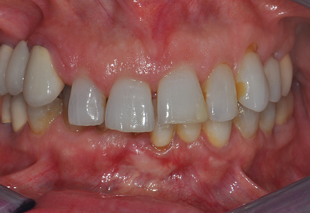 Diagnosis: Generalized moderate to advanced periodontitis; generalized recurrent caries related to medication-related dry mouth; posterior bite collapse with loss of occlusal vertical dimension ("mutilated dentition").