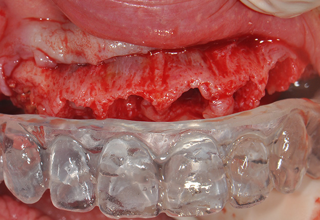 - Post-operative visits every 2-3 weeks with the periodontist office for de-plaquing, review of plaque control techniques and delivery of a water irrigation device at 6 weeks. An occlusal adjustment to be completed at each post-operative visit with the surgical and restorative offices, because the occlusion is very dynamic as the patient's musculature continues to accept her newly restored occlusal vertical dimension (OVD)