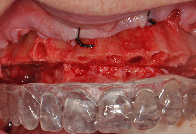 The patient was pre-medicated with oral sedation (Triazolam 0.25mg), amoxicillin, a steroid dose pack and chlorhexidine gluconate (CHG) rinse all starting 1 hour prior to surgery. The patient's chin and nose were marked with indelible marker, and the OVD was measured using a sterile tongue depressor with similar markings while the patient remained closed. The patient was then given full mouth local anesthesia. Starting with the maxillary arch, full thickness flaps were raised and sutured to the buccal mucosa with 4-0 silk to provide improved surgical access and vision. The teeth were removed with the goal of buccal plate preservation using the PIEZOSURGERY® (Mectron: Columbus, OH) for bone preservation (tips EX 1, Ex 2, Micro saw: OT7S-3). The sockets were degranulated with PIEZOSURGERY® (tip: OT4) and irrigated thoroughly with sterile water. With the anatomically correct surgical guide in position and firmly held in place by the surgical assistant, measurements were made from the mid-buccal of each tooth. Surgical cuts were made going from the anticipated cantilever of site #3 to site #14 using the PIEZOSURGERY® saw (tip: OT7 ). Our team goal was to create the prosthetic room necessary for a hybrid restoration i.e. 10-12 mm. The cuts were intentionally extended beyond the anticipated cantilever length to create adequate strength and thickness of the final prosthesis in these unsupported cantilever areas. (Fig 5, Fig 6) The mandibular arch was treated in a similar manner. Additionally, bilateral mandibular tori reduction were accomplished with the aid of the PIEZOSURGERY® saw (tip: OT7) after the extractions and prior to the vertical bone reduction of the mandibular ridge. Subsequently the implants were placed.