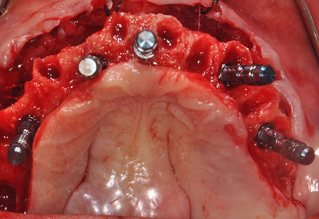 Based on CBCT analysis it was decided to place 5 implants in the upper jaw using sites: #4 (tilted), #7, between #8 & #9 (midline), #10 and #12 (tilted) after vertical bone reduction for prosthetic room. Four implants were anticipated to be placed in the lower jaw in sites #21 (tilted), #23, #26, & #28 (tilted). The anticipated position of each implant is desired to be palatal in the maxillae to the original teeth and lingual to the original mandibular teeth. This is to allow for screw-access holes exiting away from the incisal edges anteriorly, and if possible lingual to the central fossae in the posterior sextants. An additional benefit of palatal and lingual placement of each implant is that their final position will be at least 2-3 mm from the anticipated buccal plates, which is beneficial for long-term bone maintenance and implant survival. If the necessary 2 mm buccal bone to the final implant position is not available, then contour augmentation (bone grafting) is recommended to create that dimension. The goal is to prevent buccal wall resorption over time using slowly resorbing anorganic bovine bone and a resorbable collagen membrane. This membrane allows easy contouring and flexibility over the graft material when it is wet. It is also important to evaluate tissue thickness. It is ideal to have at least 2mm of buccal flap thickness over each implant as thin tissues are associated with bone loss and recession over time. Either connective tissue grafts from the palatal flap or tuberosity can be harvested and sutured under the buccal flap. Alternatively, an allograft connective tissue or a thick collagen material can be used to thicken the buccal flaps when necessary.