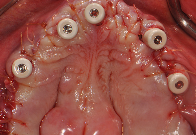 The implant sites were prepared using the manufacturer's protocol (except for bone tapping) for the Straumann BLT implant. The implants were placed using the surgical guide template with the following insertion torques measured: site: #4, #7, #8-9,#11,#13, #21,#23,#26. All torques were >35Ncm with #28 recording 20Ncm insertion torque values. All implants were 4.1mm in diameter and 14mm in length except #7, #8-9, and #11, which were 12mm in length (Fig 7). All 17 and 30 degree-angled implants were bone profiled prior to SRA abutment placement. This allowed the complete seating of the SRA abutment at the recommended 35Ncm torque. Using the available Straumann bone profilers with the appropriate Narrow Connection (NC) or Regular Connection (RC) inserts was a critical step for an abutment to fit correctly. The following SRA abutments (all were 2.5mm gingival heights) were then chosen: straight: #23, #26; 17 degrees: #4, #7, #8-9; and 30 degrees: #11, #13, #21, and #28. Tall protective healing caps were then placed (Fig 8), and the dentures were checked to evaluate that there was adequate space for the pink acrylic to allow for bite registration material thickness. All sockets and buccal gaps to the immediately placed implants were bone grafted. Prior to suturing, the tissue flaps were scalloped with 15c blades to reduce overlap of the flaps over the protective caps. This not only aided in post-operative healing, but also aided in the visualization of the abutments by the restorative dentist for the provisional insertion. The patient was sutured with resorbable 4-0 chromic gut and 5-0 Vicryl™ sutures (Ethicon: Johnson & Johnson) and was released to be seen immediately by Dr. Randel for the coordinated restorative visit. As discussed below, his responsibilities included: bite registration, impressions, and the dental lab conversion of the complete denture to a metal reinforced fixed transitional prosthesis (indirect provisionalization technique). Our team of restorative dentists have been treating full-arch immediately loaded cases on 5-8 implants (depending if restoration is a hybrid or C&B) since 1994. Our earlier experiences, for approximately the first two years (1994-1996), have us all presently using the indirect technique, which in our hands is easier for everyone involved (especially the patient). We handle these coordinated visits between offices, the dental lab, and our Straumann representative weeks prior so we are all on the same page with timing. These coordinated efforts could be compared to a symphony orchestra, where each musician knows their specific part and when and where they are expected to be. Many of our patients have described this fluidity as a seamless experience that they witness first hand and greatly appreciate.